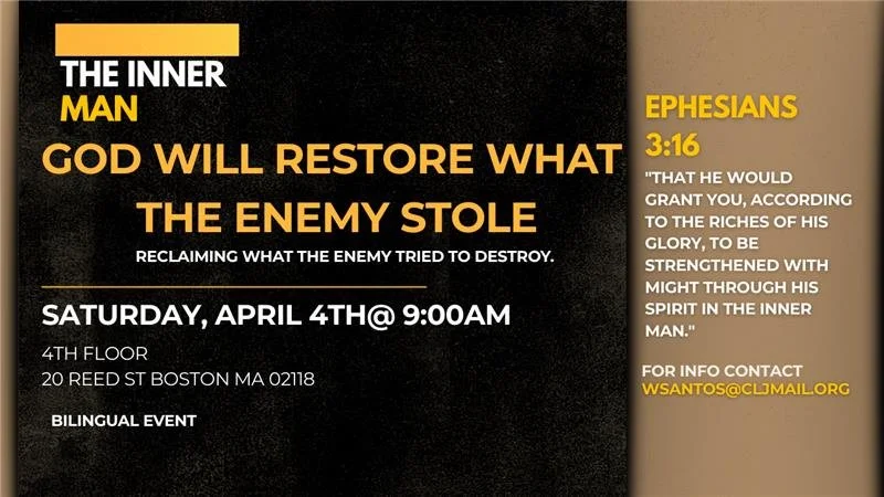 The inner man Saturday, April 4, 2026 9:00 AM 11:00 AM Lion of Judah 20 Reed Street Boston, MA, 02118 United States (map) Google Calendar ICS